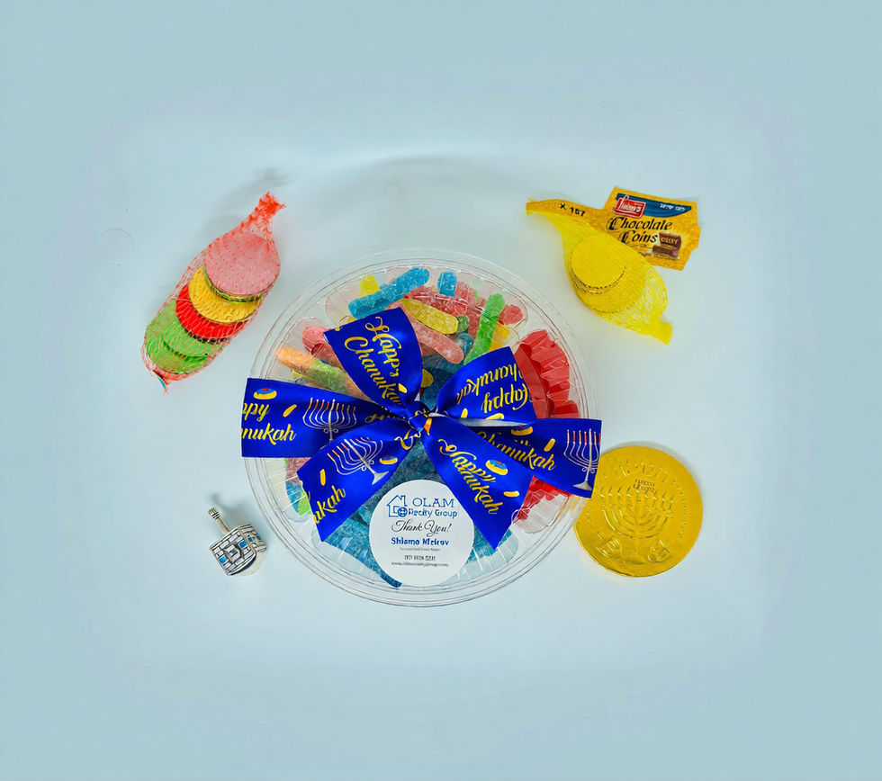 Make Hanukkah sweeter with a gift that’s ready to impress. This clear round candy box showcases a vibrant mix of sour gummies in assorted shapes and colors, sealed for freshness and wrapped with a blue Happy Chanukah ribbon. Personalize the center label with your brand or family name to turn it into a memorable corporate or hostess gift. Ideal for office drop-offs, school events, and lighting-night treats. Certified-kosher assortment; parve options available upon request. Bulk pricing and quick turnaround for large orders. Add a custom message at checkout and we’ll deliver it beautifully packed and ready to share. Email us at info@candyliciousny.com your logo or design to apply the custom sticker.